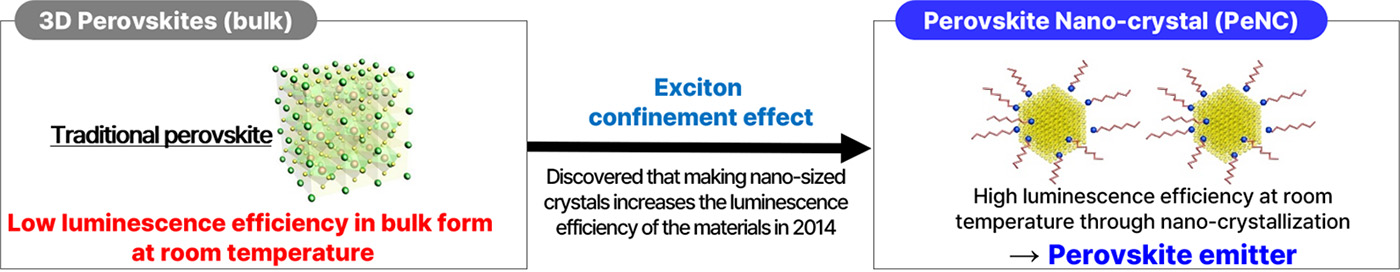 However, we overcame this obstacle by downsizing the material to nanometer scale, significantly enhancing its room-temperature electroluminescence efficiency to levels comparable to with conventional OLEDs. This remarkable efficiency boost is driven by the exciton confinement effect, which facilitates efficient exciton recombination by increasing exciton binding energy, which can prevent thermal dissociation of excitons at room temperature and thereby enhancing radiative emission. This innovation laid the foundation for a new era in display technology, with the exceptional optoelectronic properties of PeNCs such as superior brightness, high absorption, and excellent color purity.