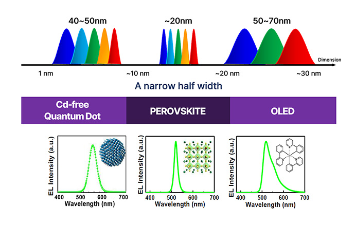 Perovskite, specifically metal halide perovskites, characterized by it's unique ABX₃ crystal structure—where A is a organic ammonium cation (MA+,FA+) or inorganic alkali cation (Cs+), B is a transition metal cation (Pb2+, Sn2+, Cu2+), and X is an halide anion(Cl-, Br-, I-)—are emerging as revolutionary candidates for next-generation light-emitters, particularly in Perovskite LEDs (PeLEDs), and Perovskite Color Conversion Layer for integration with LCD, OLED, and inorganic LEDs. Perovskites offer high luminescence efficiency, excellent color purity, and low-cost solution processability, positioning them as strong contenders to replace traditional OLEDs and QLEDs.